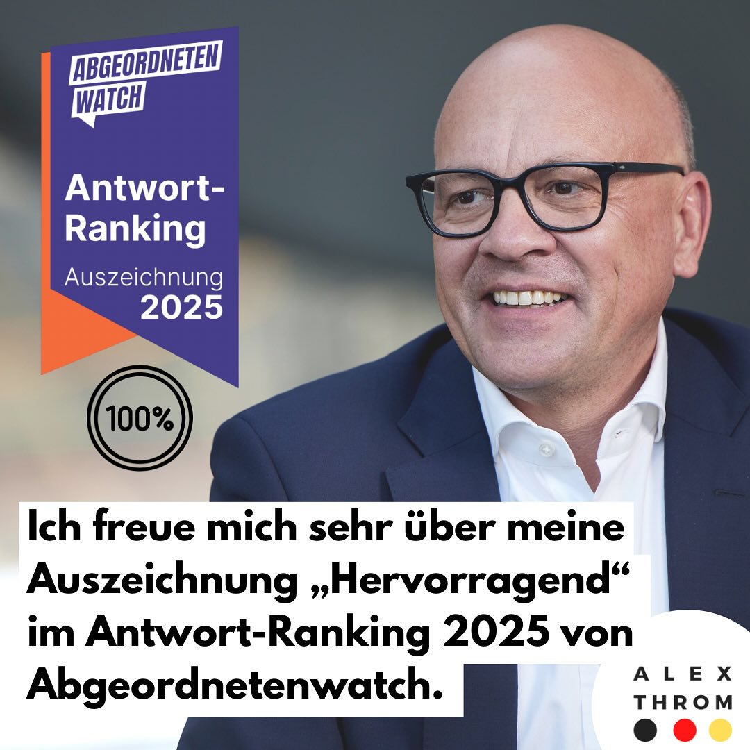 mehr🥇Im Antwortranking 2025 von @abgeordnetenwatch wurde ich aktuell mit der Bestnote "Hervorragend" ausgezeichnet - bei einer Antwortquote von 100%. ✅ Da mir der direkte Austausch mit den Bürgerinnen und Bürgern, insbesondere aus meinem📍Wahlkreis Heilbronn, sehr am Herzen liegt, freue ich mich natürlich sehr über die Auszeichnung. 🙌 #abgeordnetenwatch #auszeichnung #throm #CDU #deutscherbundestag #wahlkreis267
