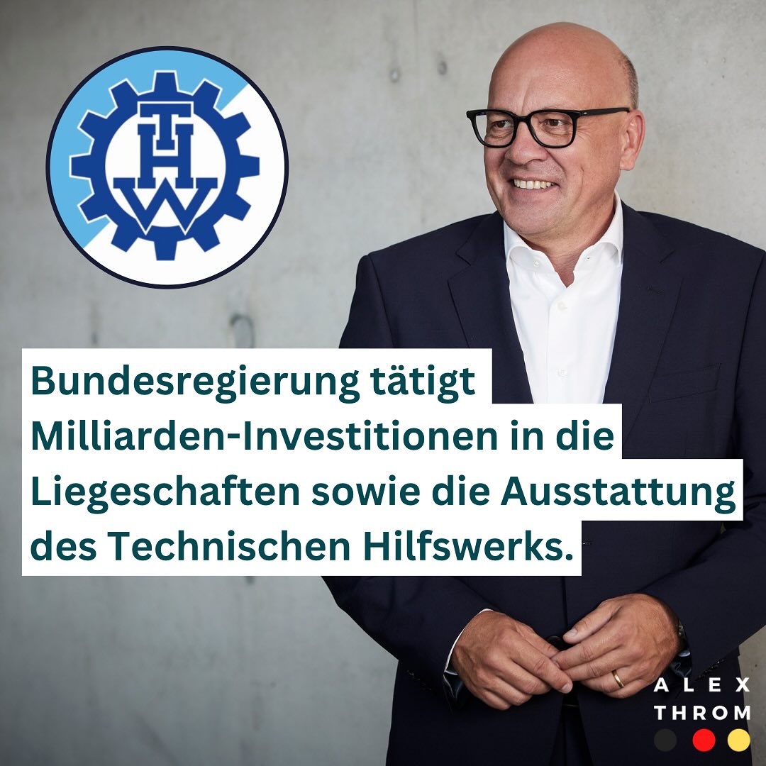 mehrAls Präsident der THW-Landesvereinigung Baden-Württemberg freut es mich ganz besonders, dass wir als Regierungskoalition im neuen #Haushalt für einen finanziellen Aufwuchs beim Bevölkerungs- und Zivilschutz sorgen, wie er noch nie zuvor da gewesen ist . Das #THW, welches das Rückgrat des Bevölkerungsschutzes in Deutschland bildet, profitiert dabei von Milliarden-Investitionen. 💶 ➡️ So stellt der Bund allein insgesamt rund eine Milliarde Euro für die #Liegenschaften sowie die #Ausstattung des Technischen Hilfswerk zur Verfügung. Daneben erhöhen wir die Mittel für die Ortsverbände um 2 Millionen Euro und mit weiteren 9,7 Millionen Euro werden kurzfristig zusätzliche Beschaffungen ermöglicht. 🙌 Damit stärken wir unserem Bevölkerungsschutz in Deutschland 🇩🇪 nachhaltig den Rücken und unterstützen die so wichtige Arbeit der unzähligen haupt- und ehrenamtlichen Helferinnen und Helfer in unserem Land. Super Sache! 💪🏼 #thw #technischeshilfswerk #bevölkerungsschutz #ehrenamt #haushalt #cdu #throm #deutscherbundestag